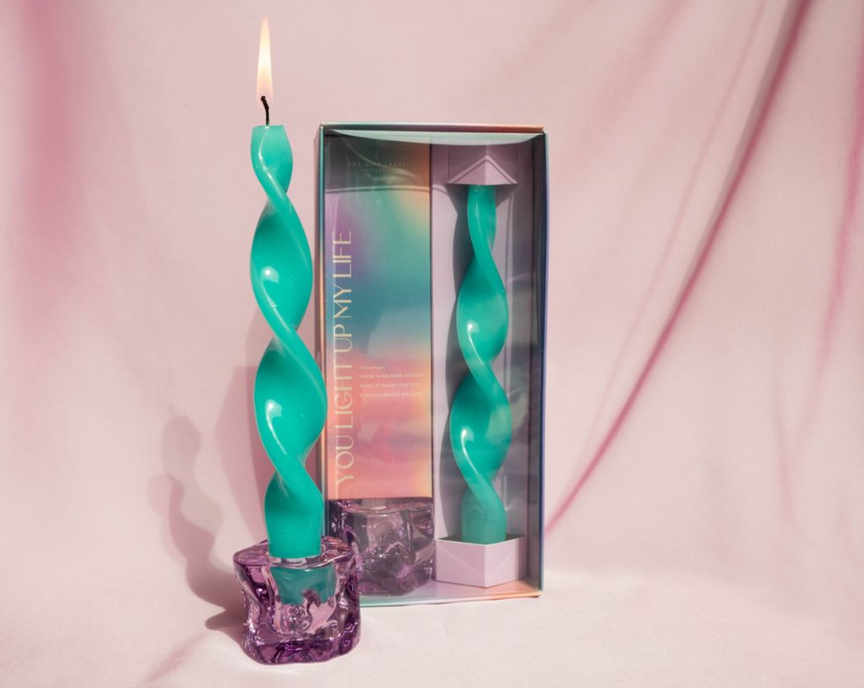 We hebben een swirl kaars met bijpassende houder ontwikkeld in kleuren die aansluiten bij de huidige kleurrijke collectie van het merk. De verpakking is erg belangrijk, het heeft een gifting uitstraling en de houder en kaars zijn goed zichtbaar. Leuk om cadeau te geven!