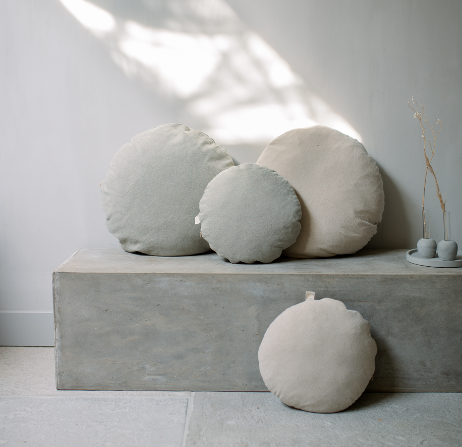 Naast plaids hebben we ook kussens mogen toevoegen aan het assortiment, dit in een natuurlijk materiaal. Linnen gecombineerd met katoen.